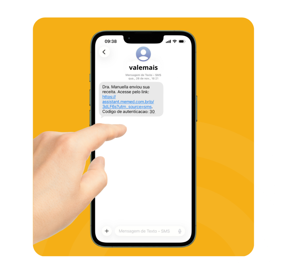 Imediatamente após a consulta, o médico envia a receita digital com assinatura eletrônica direto no seu celular por SMS. Ela é aceita em qualquer farmácia do Brasil, física ou online.